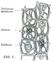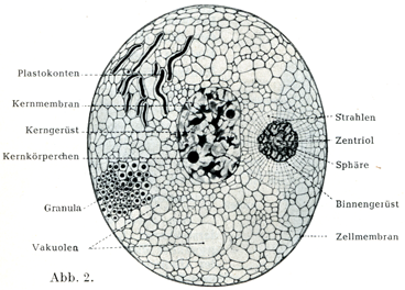 動物の細胞tierische Zelleに養分として役立つものは,その化学的組成がその細胞を構成している物質に近い一致をもつものでなくてはならない.植物の細胞pflanzliche Zelleでは事情が大いに違っていて,これは合成の仕事を営むようにできている.われわれのみる所では,細胞の栄養という問題で直接にはたらいているのは副形質Paraplasmaであって,これは蛋白質やその他の栄養物質の溶けた液体であり,生命のやどる細胞核や細胞体内の線維のまわりを浸しており,これらに必要なものをあたえ,老廃物をこれらから取り除き,また浸透圧をもひきつづき作っている.