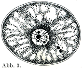[図3]コウモリ卵巣にて成熟しつつある卵.原形質は小梁状の構造をしっめし,そのあいだに液胞をもっている.切片標本による.×330. (Rauber, Morph. Jahrb. VIII.,1883, Neue Grundlegungen usw. より.)