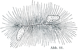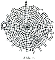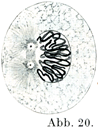 その糸の配列をよく見ると,明らかな極的差異polare Unterschiedeがあらわれていることがある.つまり糸がそれぞれ1本のわなをなしていて,わなの頂(曲がりかどのところ)が核の1極すなわち極野Polfeldにむかっており,わなの両端はその反対側Gegenpolseiteにむかっている.個々のわな状の糸は,その数が一定しているが,多数の側枝によってたがいに結びついている.側枝は二次糸sekundäre Fädenであって,それより太い一次糸primäre Fädenとは区別されるのである(Rabl).