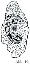 Calkins (Ann. N.-york Akad., XI.,1898)によれば原生動物で最も簡単な形の核は分散型verteilter Kernであって,細胞体内に散らばった顆粒からできている.それより高等なのが中間型intermediärer Kernで,クロマチンの顆粒が1個所に集まっている.核膜はあったりなかったりする.後生動物がもつような核,すなわちリニンではっきりした足場ができていて,その糸にクロマチンが宿っている核は,原生動物でも時たまみられるのである.