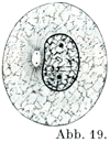 1. 前期Prophase:休止している核についてまず述べること,このものは核膜,核材,核小体からできている.核の1個(極側Polseite)に軽いへこみがあって,そこの原形質のなかに中心球が1個あるいはすでに2個となった中心子をもって存在している(図19).