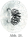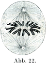 2. 中期Metaphase(図22):中心紡錘の形成は最高潮に達していて,その長軸は細胞じしんの長軸と一致している.染色体はそのあいだにいっそう短く太くなり,係蹄の曲がりかどを中心紡錘にむけ,係蹄の両脚を細胞の周縁の方に向けるように位置する.この時期の細胞を1極からみると,染色体の集まりが1つの星の形をしている.これを母星Muttersternあるいは単星Monnasterの時期という.同時に染色体は中心紡錘に垂直の一面上にある.この面は赤道面Äquatorialebeneとよばれる.赤道面はあとに細胞体の分裂が起こる場所にあたっている.