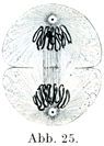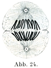 3. 後期Anaphase(図23, 24):娘係蹄はそれに付着している,そして収縮する性質のある牽引糸(すなわち外套糸)によって一方の中心球へ引き寄せられる.そのときに中心紡錘の線維は収縮する性質を欠き,支持糸として2つの中心球がたがいに近づかぬように支えている.れにまた,中心球のまわりから発して細胞の表面に付着している放線もその支持にあずかるのである.これが娘星Tochtersterneあるいは双星Dyasterの時期である.両極に向かってはなれつつある2群の染色体の集まりのあいだは結合糸Verbindungsfadenという細い糸でたがいに結びつけられているようである.結合糸はたぶん中心紡錘の線維にほかならないであろう.