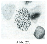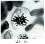 核の染色されやすい物質はまず1本,2本あるいはそれより多数の糸を形成し,これが核膜のなかでうねってもつれたようになっている(毛毬Spirem).毛毬は初めは密であるが,次第に疎になる.そしてこの糸が染色体Chromosomenとよばれる一定した数の断片に分かれる.