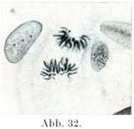 G. Hertwig (Sitzber. naturf. Ges. Rostock,1930)は染色体が律動的な成長をなして,その量が倍加すると考えた.1価の染色体から2価のものができ,また後者が倍加をくりかえして4価およびそれ以上の価の染色体ができる.そういう倍加成長をした各時期の終わりには染色体は分裂する能力を持ち,それを含む核は分裂の用意ができている.そのときに本当に分裂がおこるかどうかは他の因子によって決まるのである.温熱や冷却やコルヒチンColchicinのような化学物質によって染色体の数が何倍にも増したりする(倍数性Polyploidie) (Häggquist, G.,1948, Häggquist, G. und Bane, A., Nature, Vol.165,1950, Melander, Hereditas, Vol. 36,1950).