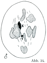 [図34]ヒトの精母細胞SpermiocyteにおけるX-およびY-染色体(Painter, J. exper. Zool., 37. Bd.,1923による.)