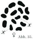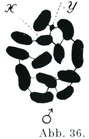 [図37]Lygaeus turcicusの精母細胞Spermiocyteの第2分裂におけるX-およびY-染色体.(図35~37はEd. B. Wilson, J. exper. Zool., 3. Bd.,1906による.)