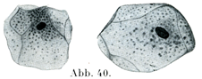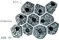 扁平上皮の細胞は平たくて薄く,小鱗状の板をなし,その境界線が多くは不規則である.ただ網膜の色素上皮(色素層Stratum pigmenti)の細胞は規則正しい六角形をしている(図39).他の細胞,たとえば口腔上皮の表面の細胞は不規則な輪郭をしめす(図40).そのほかの扁平上皮細胞でも五角形あるいは六角形をするものがあって,その境界が直接的ではあるが,境界線の長さがまちまちである(図46).