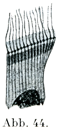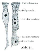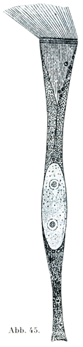 絨毛細胞Flimmer-oder Wimper-Zellenは円柱状または円錐状の細胞で,その自由面には多数の細かい毛が生えていて,その毛が細胞の生きているときは運動bewegen od. flimmernする.この絨毛は小皮縁Kutikularsaumという細胞体の縁の固い特別な1層付着している.そこで基底小体Basalkörperchenというものと結合している(図43~45).これからさらに細胞体の内部に細かい糸状物がのびて,これが集中しながら円錐状をなすので,絨毛根円錐Wimperwurzelkegelとよばれる.楕円に近い形の核が小皮縁からいくらか隔たったところにあり,その長軸は細胞じしんの縦軸と平行している.絨毛細胞の基底部は円錐状に細くなり,尖った突起をなしている.それが数本の細い糸状物に分かれていることがあって,これが上皮の下敷きをなすものに鈎で止めたように付着している.