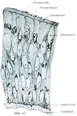 6. 重層絨毛上皮geschichtetes Flimmer-Epithel:呼吸道では鼻腔からはじまって気管支の細い枝まで,ただし声帯ヒダの自由縁をのぞく.そのほかに血管や鼻涙管がこの種の上皮で被われている(図57).