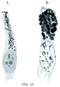 [図48]サンショウウォの腸上皮細胞における粘液形成.Aは小さい粘液顆粒をもつ細胞.Bは大きい粘液顆粒をもつ細胞.(Heidenhain, Plasma und Zelle. Bd. Iによる.)