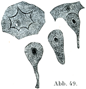 [図49]家兎の臍胱より得た移行上皮細胞.×300. 左上:表層の幅の広い平らな細胞で2つの核を有し,下面に鋭く突出した明瞭な縁とへこみをもっている.下:それより深い層に属する2つの西洋梨型の細胞.右上:西洋梨型の細胞が1個,表層の細胞がもつへこみのかなにはまっている.(Kleinに基づいてSchäferが描いたものよりとった.)