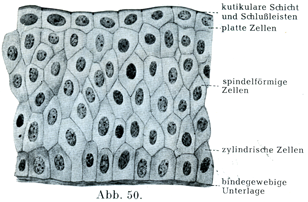 ここで注意するべきは,最も表面の細胞層のみが扁平な細胞からできていることである.最下の細胞層をなすものは円柱状であり,それに次いで多角形の細胞が集まっている.これは隣接する細胞から圧をうけて多角形となっている.表面の近くにある細胞は扁平であるが,最も表層にあるものだけが薄くて小鱗状である.細胞の形に応じて核の形および位置も変化する.核は下部の円柱細胞層では楕円に近い形であり,中くらいの層ではほぼ球形を呈し,上部の層では平たくなっている.