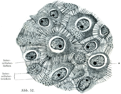 [図52]細胞間橋 ヒトの表皮の切片.×1000. 細胞間隙が広くなっている.そのために細胞間橋のランヴィエ小節Ranviersche Knötchenが存在しない.*は核小体.