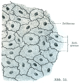 一般的性状:上皮細胞は原形質と核より成り,はっきりした境界を示す細胞である.細胞膜はしばしば欠けて,原形質の周縁部が固くなって細胞膜の代わりをしていることが多い.大多数の上皮細胞は軟らかくて,従って周囲の圧関係に容易に適合できるのである.しかしまた正にその配列のために上皮細胞は事情によっては,かなり強い圧をたがいに及ぼしあうことができるのであって,そのために特に胎生期には形態発生の重要な諸現象を引き起こし得るのである.なお成体においても多くの上皮細胞団はその構成要素すなわち個々の脂肪がたがいにおよばす圧のもとにある.細胞の形が容易にそのことをしめしているが,その他の点からもこれは証明できるのである.