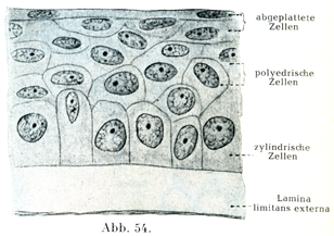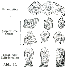形状によって4種を分ける:扁平上皮Platten-Epithel(敷石上皮Pflaster-Epithelともいう),円柱上皮Zylinder-Epithel, 絨毛上皮Flimmer-Epithel, 移行上皮Übergangs-Epithelである.