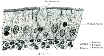 円柱上皮細胞や絨毛上皮細胞のそれぞれの集まりの中に,機能の上からは粘液細胞Schleimzellenとよばれ,形状の受けからは杯細胞Becherzellenとよばれる一種特別な細胞がある.その形は分泌物を含む量によって変わる.分泌物をほとんど有しないときは円柱細胞の観を円柱細胞の観を呈しているが,粘液が増していくると樽のような形になる.それも初めはまだ細長いが,だんだんと丸みをおびて膨れてくる.そうすると核は原形質の残りといっしょに細胞の基底部に移り,核の形が変わる.細胞の自由端のところが開いて粘液が密雲か綿雪のように膨れてその口から出て行く(図42, 47, 56, 57).