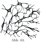 上に述べた3つの成分はこの組織群に属するいずれの種類の必ず存在するが,その中で最も本質的なものは細胞であって,これから他の2成分ができるのである.つまり細胞が細胞間物質および原線維をつくる.-早い時期の胎児では始めに結合組織Bindegewebあるいは間葉(間充組織ともいう)Mesenchymとして細胞が集まって網状を呈していく(図63),この細胞が突起をだしてたがいにつづいている.間葉の細胞は結合および支持組織のいろいろの種類ができてくる源なのである.