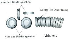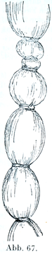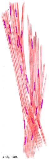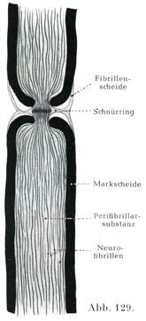 ランヴィエ絞輪ではシュワン鞘もまたその形成に大いに与っている.シュワン鞘の深い輪状の絞れが,ある間隔をおいて軸索のすぐ近くまではいりこむので,ここでは髄質が全く欠けていることがある.軸索は絞輪のところで円錐状に太くなっていることがある(図127,129).硝酸銀で処理したばあいに,そのへこみの奥に黒く染まった横走の境界線があらわれる.それは上皮の接合線と似ている.それゆえシュワン鞘は管状をなす分節の集まりでできているのだろうと考えるのである.銀液はここからその程度は個々のばあいによって違うが,多少とも軸索の中に或る距離だけ及ぶのであって,かくしてラテン十字lateinisches Kreuz (Ranvier)[銀十字Silberkreuzと同意語である.(小川鼎三)]とよばれる像が生ずるのである.銀の沈着した軸索がしばしば横の縞模様を呈して,明るいすじと暗いすじが交互に重なり合っている.これがフロムマンの横線Frommannsche Linienである.神経線維じしんは絞輪によって外面的にはいわゆる輪間節interanuläre Segmenteに分かたれている.輪間節の長さすなわち絞輪間の距たりは細い線維で0.08mm,太い線維では1mmに達する末梢の有髄神経線維のすべてが絞輪をもっている.神経根の線維も同じである.