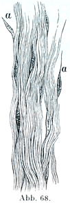 b)シュワン鞘を欠く無髄線維は裸軸索nackte Achsenzylinderという不当な別名をもらっていたことがあるが,そのかなり長いものは人間では嗅糸Fila olfactoriaにあるのみである.これは嗅上皮存在する感覚細胞の中心性突起であって,0.5µの太さにも達しない.
