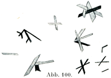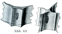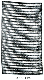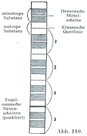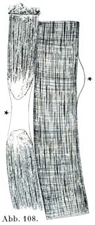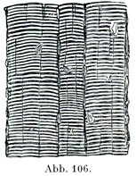 切れ込みの第2の型は髄鞘のみに関係するのであって,1個の輪間節の中で,髄鞘はシュミット・ランターマン切痕という細かい漏斗状の切れ込みによって,1列をなしてならぶいくつかの小さい円柱円錐分節zylindrokonische Segmenteに分かれている.シュミット・ランターマン切痕はあるいは中心端の方へ,あるいは末梢端の方へ傾いた斜めの方向をとっている.そしてすでに新鮮な神経線維でも見られるのである.この切痕をつくっている詳細な物質は接合質に近縁のものである.