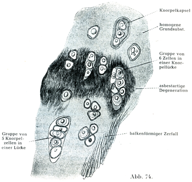 ここでは脊索Chorda dorsalisの組織について一言しておこう脊索は密に相接しあった細胞の集まりより成っていて,この細胞はやや進んだ段階では細胞膜をもち,細胞間橋(Studnicka)によってたがいに結合しているが,細胞間物質はごく少ししかなくて,そこに初めは膠原CollagenもコンドリンChondrinも含まれていない.しかしそれよりあとになると脊索組織の内部でそこそこに細胞壁が厚くなり,またその化学的性質がかわって,いわゆる脊索軟骨Chordaknorpelができる.それゆえ脊索の組織は学者によって結合組織に数えられ,あるいは上皮組織に数えられたりする(44頁を参照のこと).Schafferはそれが軟骨組織や結合組織に属するものではないと考えた.彼によればそれは支持物質の特殊な一型であって,宗族発生的に“軟骨組織の前進とみなされるものであり,軟骨様支持組織chordoides Stützgewebe”と呼ぶことができるのである(Anat. Anz., 37. Bd.,1910).-Studnicka, Z. Zellforsch.,13. Bd.,1931をも参照のこと.脊索の増殖した残物が成人にもなお存在している.