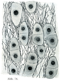 円柱上皮細胞はいろいろの長さの稜柱の形をしている.それには(いわゆる)立法形の細胞kubische Zellen[「立法形」の細胞“kubische”Zellenという名前はよくない.さいころの形をした細胞を誰もみたことはあるまい.いわゆる立法形の細胞はその形から云えば五角形あるいは六角形の円柱状または稜柱状の細胞で丈の低いものである.(原著註)]からの眼の水晶体をなす長いひものような“水晶体線維”Linsenfasernまであらゆる形のものがある.楕円に近い形の核がその長軸を細胞の縦の方向に一致させて存在する.細胞の基底部は細い突起をだして,その下にある組織に鈎をかけたように付着している.