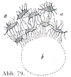 B. 樹状突起Dendritenは原形質突起Protoplasmafortsätzeともいうが,豊富にまた細かく枝分かれするので,この突起はすべての神経細胞にあるとは限らない.例えば脊髄神経節の細胞には欠けている.これが細胞体から発するところは幅がひろくて,そこから漸次的に細くなる.この点は神経突起との差異として特記すべきものである.樹状突起の分岐はたいてい同じ太さの二た叉におこる.非常に細くなった枝が中枢神経系の汎在基礎網allgemeines Grundnetzに終わっている.