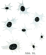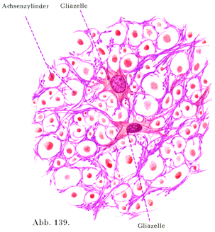 大膠細胞(図136 gl)は神経細胞にくらべるといっそう小さい(球形の)核といっそう少ない原形質をもつが,小膠細胞(図136 oglとhgl)にくらべると核が比較的大きくて,原形質もわりあい多い.そして多数の突起をもっているために星状膠細胞Astrocytenとよばれてきたのである.