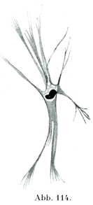 C. 神経突起Neuritは軸索突起Achsenzylinderfortsatz (Axon, Neuraxon)ともいい,すでに述べたように,多くはただ1本存在する.これは幅のひろい起始円錐Ursprungskegelをもって細胞体からおこり,急に細くなって,ついで細胞体からかなり離れたところで漸次的にふたたび太くなる.時として神経突起が細胞体からでなくて,樹状突起の幹からでている.また神経突起が多極神経細胞には常に存在するとはかぎらないで,全く欠けていることがあり,また2本以上存在することもある.