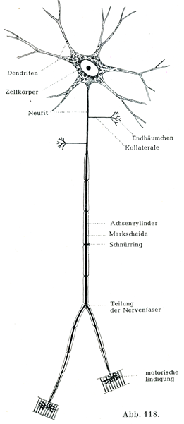 [図118]1個のニューロンを模型的に示す. 脊髄の前柱の運動性神経細胞の構造をもとにして.