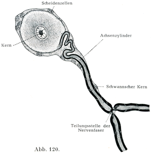 それと同時に多くのばあいは(例外:嗅糸Fila olfactoria)細胞体からいくらか離れたところで,神経突起を周囲から隔離するための被いが初めてあわれる.この鞘の種類によって有髄と無髄神経線維markhaltige und marklose Nervenfasernが区別される.