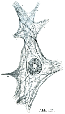 b)神経原線維はすでに古くM. Schultze, Kupffer等がみたものであって,はなはだ細い線状のものとして細胞体の中のみならず,樹状突起および神経突起の中にも見られる.原線維は細胞体の中でニッスル小体のあいだの明るい場所を通っている.原線維が細胞体の中および樹状突起の幹の中にどんな具合になっているか,その詳細の点がしばしば議論されて,しかもなお決定していない.それについては,原線維じしん,あるいはその集束がたがいに直接につづいているのか,もしくはこれらは独立しており,ただ隣り合わせて走っているのかということが議論の種になっている.Betheによると原線維は網をつくらないで,細胞を貫いて走るのが普通なのであって,格子状の構造をなすことはいっそう稀である(これは無脊椎動物に見られ,脊椎動物の脊髄神経節の細胞,シビレエイTorpedo marmorataの電気葉Lobus electricusにもみられる).この説に反してCajalやDonaggioその他の人々は原線維が細胞体の中でも樹状突起の最初の分岐角のところで網状の配列をしていることを断乎として唱えている.最もこの人たちも原線維束の一部が他のものと合したりしないで細胞を貫いてとおることも認めてはいる.また樹状突起や神経突起の中では原線維が束をなして,たがいに隣りあって存在している.