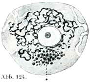 [図124]内網装置 脊髄神経節の小さい神経細胞.Kopsch-Kolatschevの方法,同時にHolmgrenの細管の数個が示されている.×1000. *は色素.
