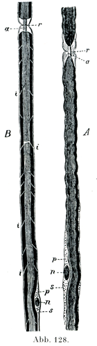 [図128AとB]オスミウム酸で処理した有髄神経線維.a軸索;sシュワン鞘;n, n神経角(髄鞘を軽く凹ませている);p, p角の両極に接している微細顆粒性の物質;r, rランヴィエ絞輪(ここでは髄鞘がなくなって,軸索がみえている);Bにおけるi, iはシュミット・ランターマン切痕に相当する円柱円錐節zylindrokonische Segmenteの境界線である.