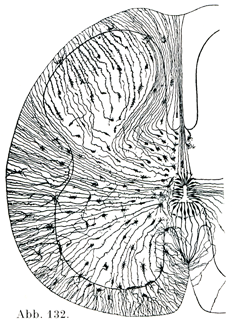 上衣線維は脳物質の中に遠くはいりこんでいる.胎児の脊髄ではそれが外表面まで達して,そこで膠小足Gliafußという小さい広がりをして終わっている.成人では後正中中隔Septum medianum dorsaleをなしている上衣線維のみが脊髄の外面まで達する.おのおのの線維がいくつかの小線維からできていて,この小線維が早晩たがいに離れるのである.