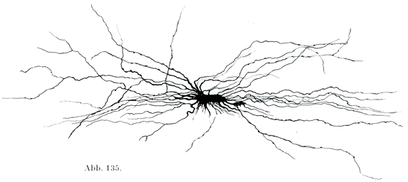 樹状突起およびその枝の全部は神経原線維とその間にある原線維間物質あるいは原線維周囲物質interoder perifibrillare Substanzから成っている.その主な幹の中にはニッスル小体が最初の叉状分岐のところまで細胞体の方からつづいており,時としてそこを越えてなおいくらか達している.叉状に分かれる角のところにしばしば色素好性物質の三角形の塊がある.またこの場所でCajalは神経原線維が1つの側枝から他の側枝に直接に移行することを見ている.こういう原線維は細胞体じしんとは何らかの関係をも持たないわけである.樹状突起の比較的太い枝は原線維の束をもっているが,最も細い枝はわずか1本の原線維とそのまわりのいくらかの原線維周囲物質とから成っている.神経細胞が死んで,それが保存されたばあいに,原線維周囲物質がいわゆる静脈瘤に似た状態Varikositätenをなす.少数の個所にそれが集合して,その他のところでは少なくなり,かくして真珠を連ねたような像が生ずるのである.