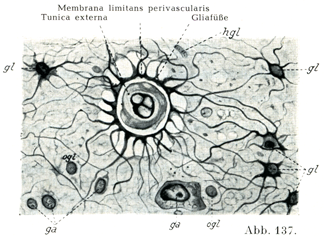 [図137]膠小足と血管周囲境界膜 ヒトの大脳皮質でグリアが増殖しているもの.(Handbuch d. Psychiatrie. A. I,1.1927. )ga, gl, hgl, oglは図136のと同じ.