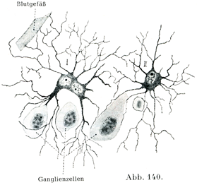 c)グリア細胞の特殊な形のものは網膜にあるミュルレル線維Müllersche Stüzfasern,なお小脳皮質の灰白質(Buschelzellen-総状細胞の意)や大脳皮質の表在層にみられるものである(第II巻を参照).