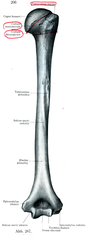 上腕骨の上端部には内側にほず半球状の関節頭すなわち上腕骨頭Caput humeri, Oberarmkopfがあって,これは解剖頚Collum anatomicumという輪状の溝によって,この骨の残りの部分から表面的にわけられている上腕骨頭の外側には1つの強く突出した部分があってこれを大結節Tuberculum majusという.その前方には縦走する深い溝にへだてられて小結節Tuberculum minusがある.