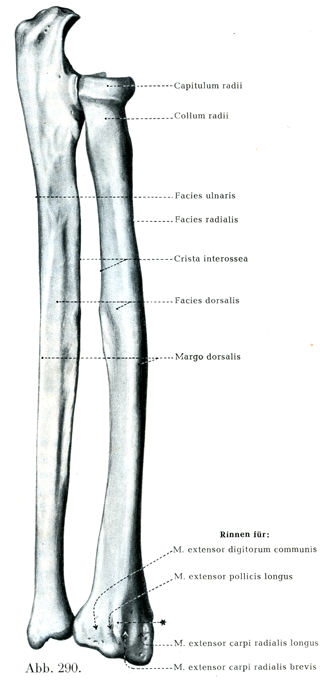 [図290]右の尺骨と橈骨 後面(2/3)*長母指伸筋をとめておくための隆起