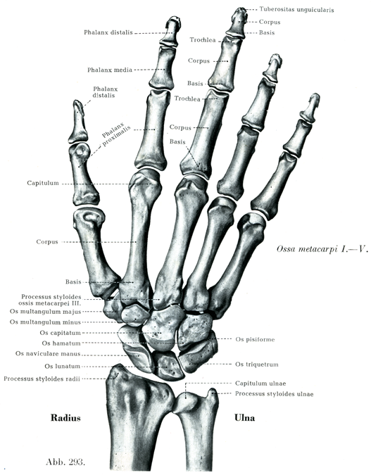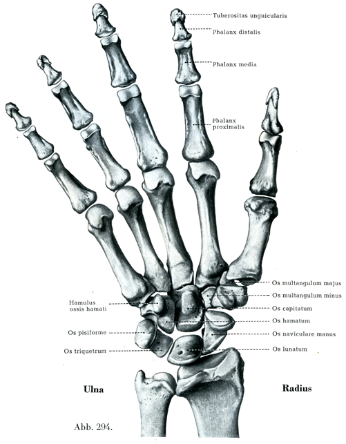 手には次の3つの大きな部分がある:1. 手根Carpus, Handwurzelには2列にならんだ短い骨がある.2. 中手Metacarpus, Mittelhandには中手骨Ossa metacarpiという5つの小さい管状骨がある.3. 指Digiti, Fingerはそのうち第2指から第5指の4本には3つの指節Phalanges, Gliederがあるが,母指には2つの指節しかない.