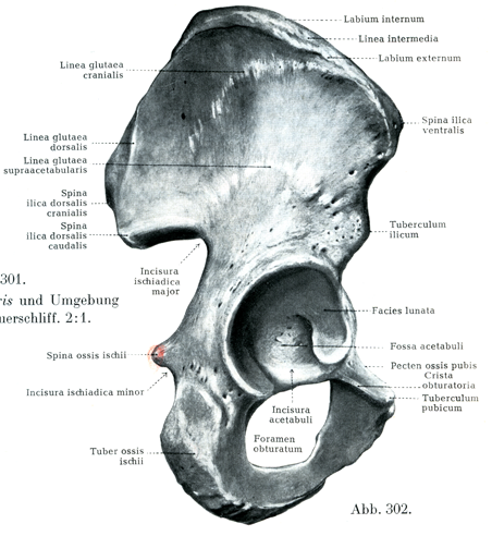 坐骨棘は2つの切痕をわけている.すなわち棘の上方にはすでに挙げた大坐骨切痕Incisura ischiadica major,下方には小坐骨切痕Incisura ischiadica minorがある.