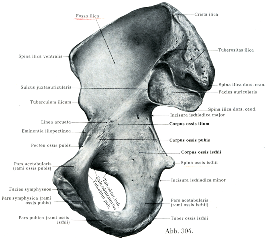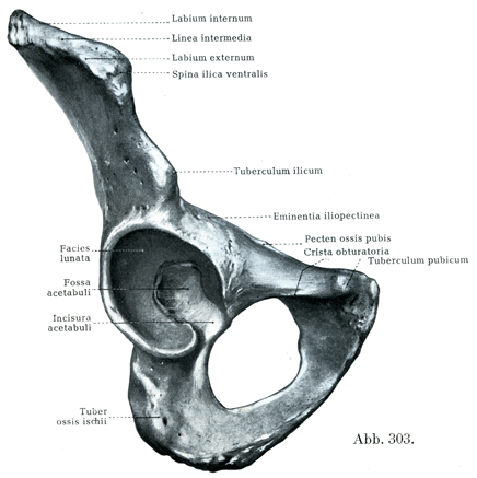 寛骨臼部は体から発するとすぐ細くなり,内側へゆくにつれてまた広く高くなる.寛骨臼部には3面と3稜がある.上面は水平方向には凹,垂直方向には凸の弯曲を示し,後面は滑かで水平方向に凹の軽い弯曲を示している.下面には斜め内側に向って走る1本の広い溝があり,これを閉鎖溝Sulcus obturatoriusという.上稜は鋭くて恥骨櫛Pecten ossis pubis, Schambeinkammをつくっている.後縁は閉鎖稜Crista obturatoriaとよばれ,内側へ走って閉鎖孔の前縁となり,その1端に恥骨閉鎖結節Tuberculum obturatorium pubicumをもつ.また前縁は内側へ走って1つの結節に終っている,ここには恥骨櫛も伸びて来ており,恥骨結節Tuberculum pubicumとよばれる.