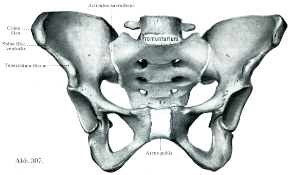 骨盤には個体差・年令差・人種差のほかに,なお男女の差がある.これはすでに若い年令段階において,またすべての人種において著しく認められる.女の骨盤では骨が男のより薄くて滑かである.またその腸骨は男のより平たくできている.女では骨盤入口は長軸を横にした楕円形で,しばしばほとんど円形である.岬角の突出の程度は少く,恥骨結合の高さは男より小さい.両側の恥骨の結合部がなす角は女の方が大きくて恥骨弓Arcus pubis, Schambogenとなっている.また女では両側の坐骨結節の距離が男より大きく,閉鎖孔は下の方で狭くなって,男のものよりいっそう三角形に近いかたちをしている.男の骨盤は側方からおされたようなかたちで,高さが女より大きい.男の閉鎖孔は卵円形である.全体として男の骨盤の特徴は「高さ」と「狭さ」であり,女の骨盤の特徴は「低さ」と「広さ」である.