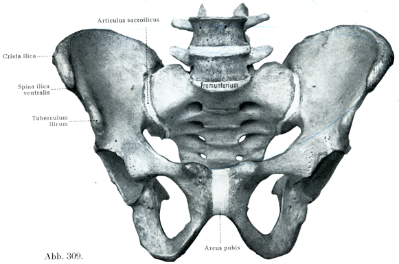 [図308, 309]男の骨盤(9/20),図308は前上方から,図309は前方からみる.図308では分界線Linea terminalisが白い境界線であらわしてある.