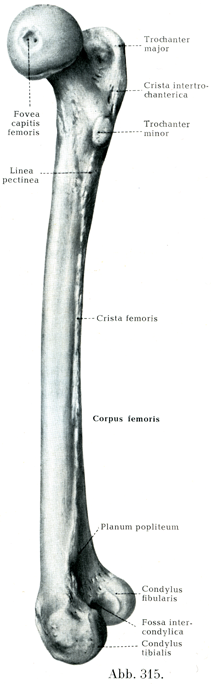 大小の転子のあたりの下方につづく体Corpus femorisの部分は前方に凸の軽い弯曲を示し,下にゆくほど著しく幅を増して,ついに脛側および腓側顆Condylus tibialis, fibularisという両関節結節に移行する.