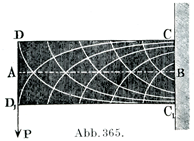 1本の柱の1端Bを壁に固定すると,最大および最小の垂直力の方向は2つの線系であらわされ,両線系は中軸と45°に交わり,柱の両縁と90°に,また両線系どうし90°に交つている.下方に凹の曲線は張力に,上方に凹の曲線は圧力に相当している.それぞれの曲線の端のうち急傾斜をなす端の方が最小の力,横に走って終る端が最大の力に相当している.従ってDおよびD1端ではこの張力は零になっているが,CおよびC1端では最大の価になっている.