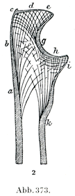 [図372~374]海綿質の曲線 図372は上腕骨の下端部,図373は尺骨の上部,図374は橈骨の上部.(Hultkranz)