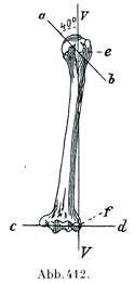 [図412] 上腕骨a, b頭および頚の軸. c, d肘関節の軸.V, V鉛直線. e, f, 頭および小 頭の中点(H. Meyer)